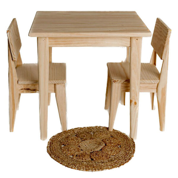 Juego de mesita y sillas para niños de 1 a 5 años en madera de pino maciza. Mesita: 50 x 50 x 50 cm. Sillitas: alto 50, ancho 35 x 35 cm.